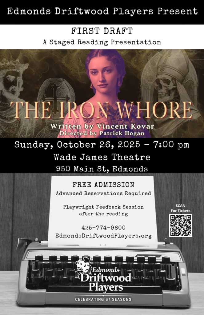 Synopsis: In 10th-century Italy, Marozia witnesses the cadaver trial of a Pope and learns a brutal lesson: whoever controls Saint Peter’s throne controls God’s voice on Earth. Through numerous seductions, strategic marriages, puppet popes, and a misadventure with beets, the Senatrix establishes “The Pornocracy” when a woman ruled like a man. However, just as the highest authority is within her grasp, she must defend her legacy from the ultimate betrayal. With six actors playing seventeen characters, The Iron Whore follows a woman who was often reviled, sometimes remembered, but one who ultimately redefined power.